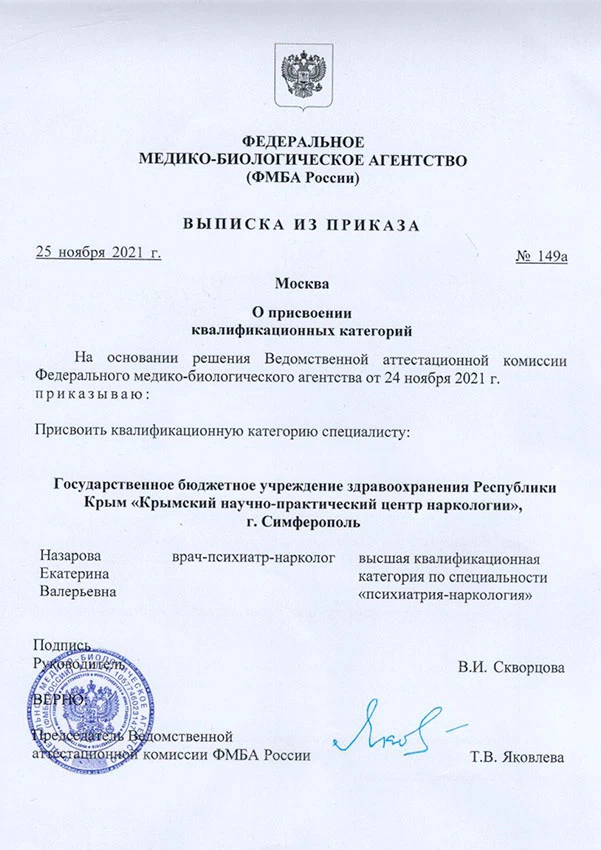 • 2015 г. — Повышение квалификации: Крымский федеральный университет имени В. И. Вернадского (психиатрия-наркология);